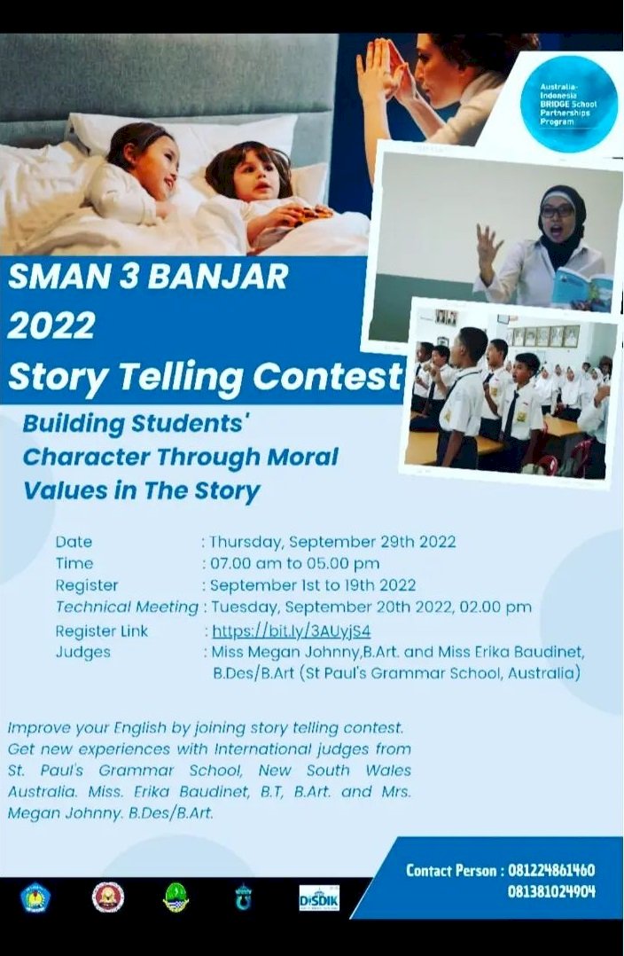Tingkatkan kemampuan bahasa Inggris kamu dengan mengikuti story telling contest ini. Dapatkan pengalaman yang luar biasa dengan juri internasional dari St. Paul's Grammer School yang berada di Australia bersama Miss Megan Johnn, B.Art dan Miss Erika Baudinet, B.Des/B.Art